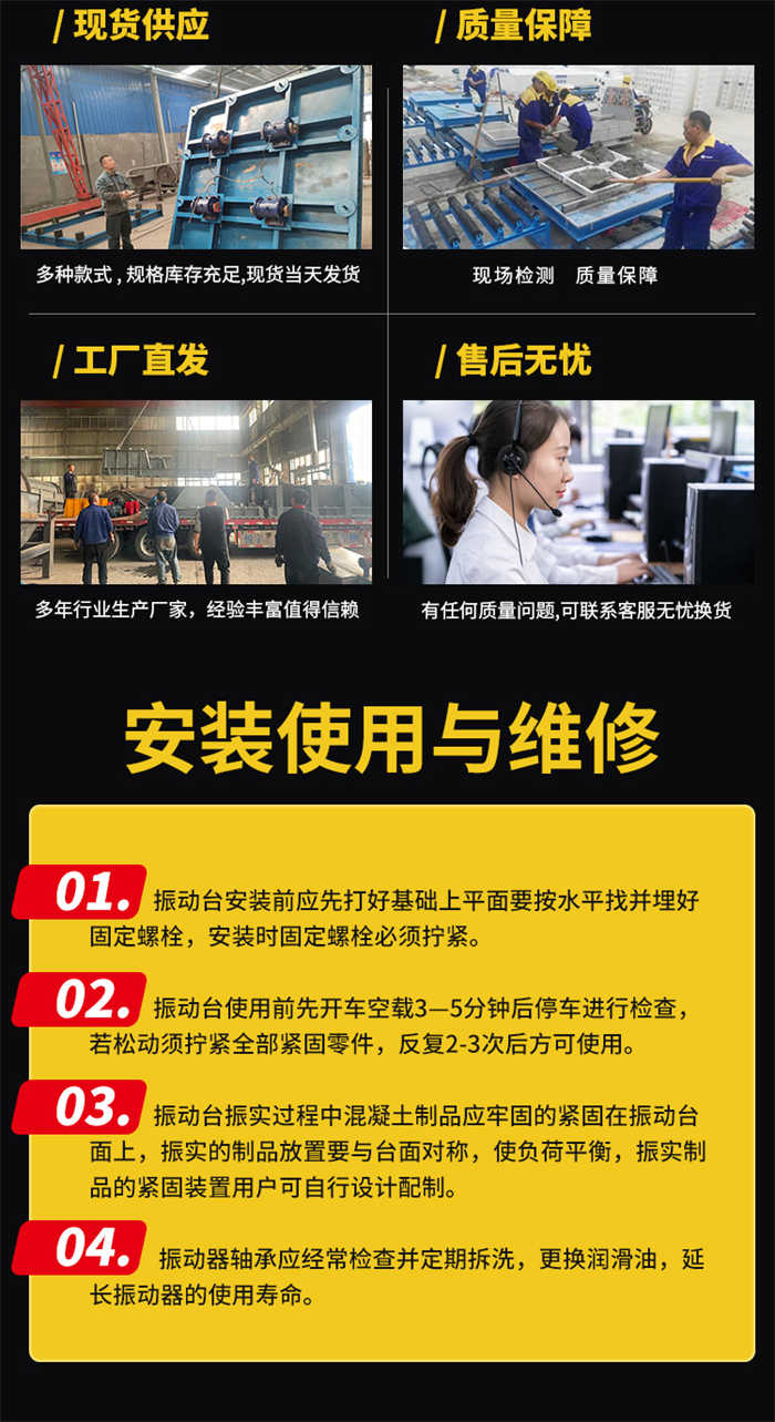 3、 振動臺在振實(shí)過程中,混凝土制品應(yīng)牢固的緊固在振動臺面上,所需振實(shí)的制品放置要與臺面對稱,使負(fù)荷平衡,振實(shí)制品的緊固裝置。用戶可根據(jù)自己的需求自行設(shè)計(jì)配制。