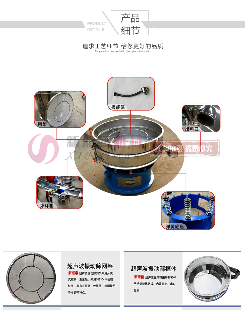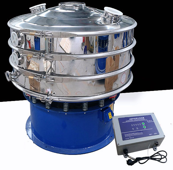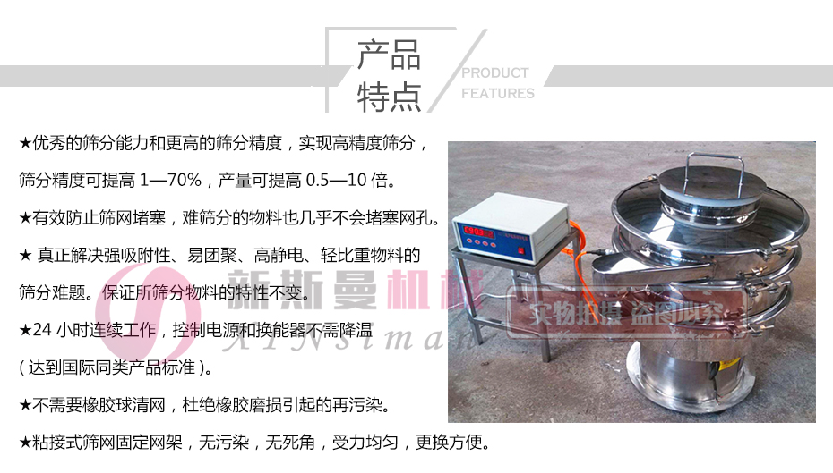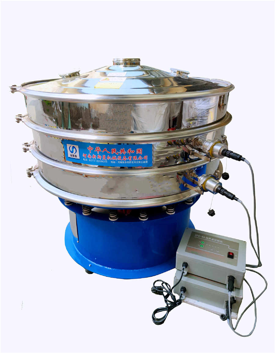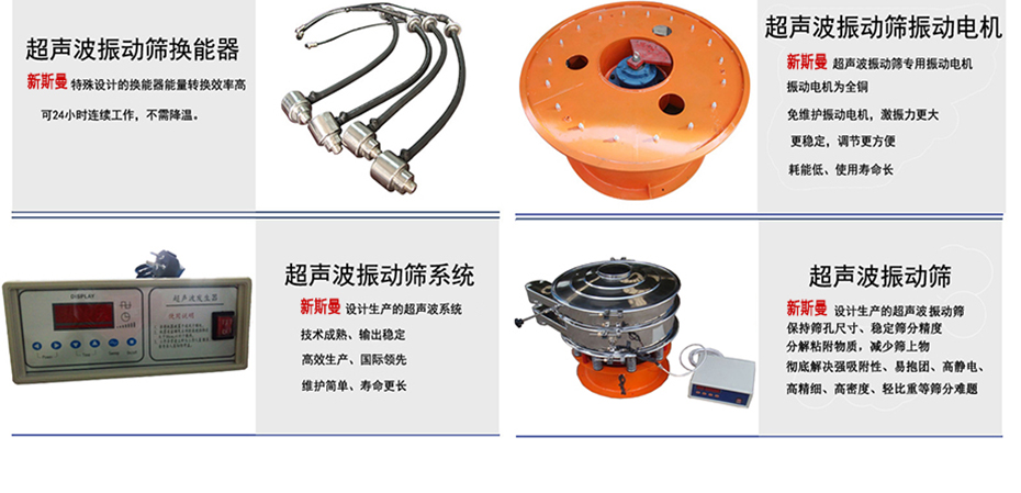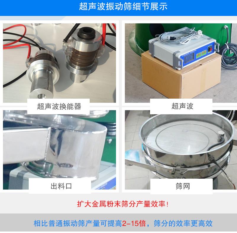 超聲波振動篩是在旋振篩的基礎(chǔ)上引入了超聲波清網(wǎng)裝置,通過將220V、50Hz或110V、60Hz電能轉(zhuǎn)化為18KHz的高頻電能,輸入超聲換能器,將其變成18KHz機械振動,從而達(dá)到高效篩分和迅速清網(wǎng)的目的,使超微細(xì)粉篩分成為易事。該系統(tǒng)在傳統(tǒng)的振動篩基礎(chǔ)上在篩網(wǎng)上引入一個低振幅、高頻率的超聲振動波(機械波),以改善超微細(xì)粉體的篩分性能。特別適合高附加值精細(xì)粉體的用戶使用。超聲波篩分系統(tǒng)是一種簡單實用、可靠的篩分系統(tǒng),是當(dāng)前網(wǎng)孔堵塞的有效的解決方法??蓮V泛應(yīng)用于制藥、冶金、化工、選礦、食品等要求精細(xì)篩分過濾的行業(yè),篩分過濾精度高,有效解決因團(tuán)聚、靜電、強吸附性卡堵網(wǎng)孔等篩分難題,是國內(nèi)篩分行業(yè)的一項重大技術(shù)突破。